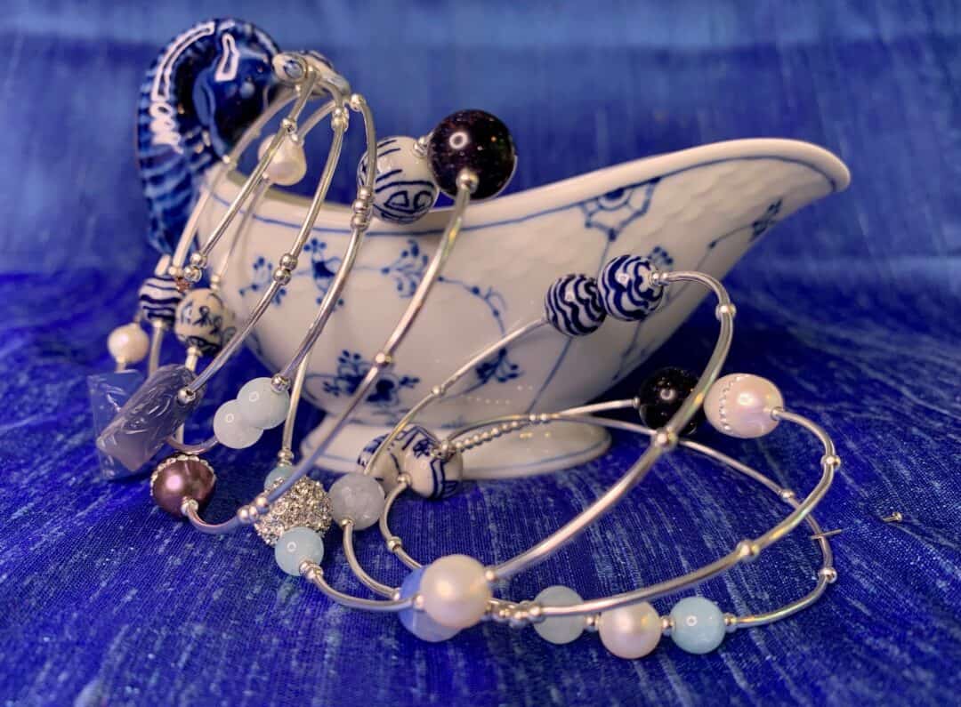 The bracelet is made of a memory wire for bracelets, stainless steel, 0.6 mm, gold plated brass bead string, metal beads 2.5 mm in gold and turquoise, jade, blue and whits porcelain beads, freshwater pearls, aquamarine, Swarovski stone and blue lace agate.